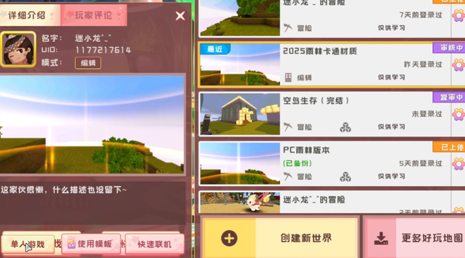 1、进入迷你世界sz版本后可以自行选择模式,退出后便是联机模式
